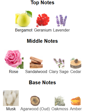 • Heart: Rose, Sandalwood, Clary Sage, Cedar