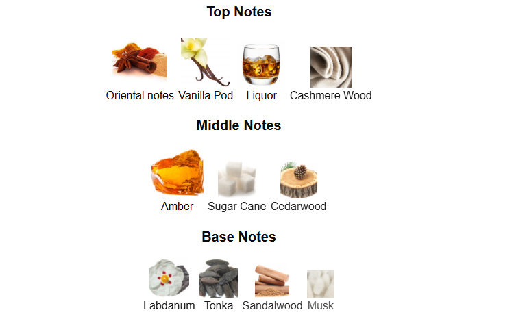 Top Notes: Oriental Notes, Vanilla Pod, Liquor, Cashmere Wood