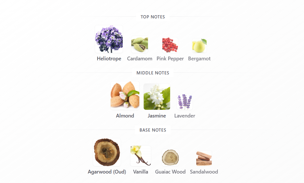 Base: Agarwood (Oud), Vanilla, Guaiac Wood, Sandalwood