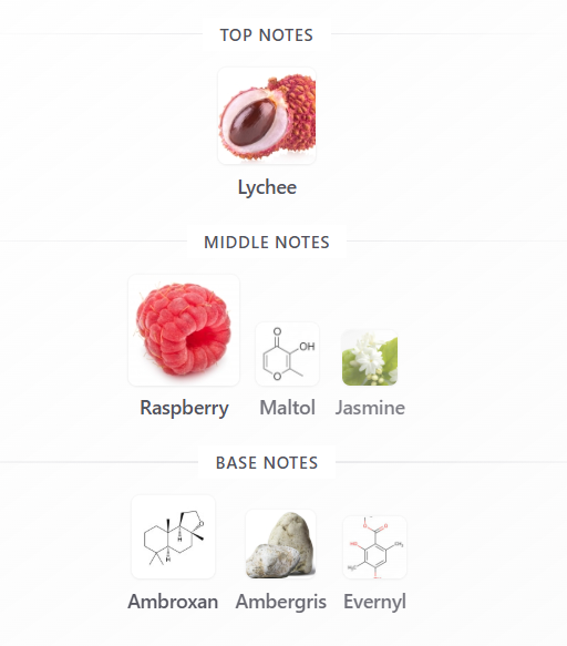 The opening bursts with bright lychee, offering an instantly refreshing and fruity lift. The heart unfolds with a playful blend of raspberry and jasmine, enriched by maltol’s gourmand sweetness reminiscent of caramelized sugar. The dry-down rests on warm ambergris, modern ambroxan, and velvety Evernyl for a clean yet addictive finish that lingers softly on the skin.