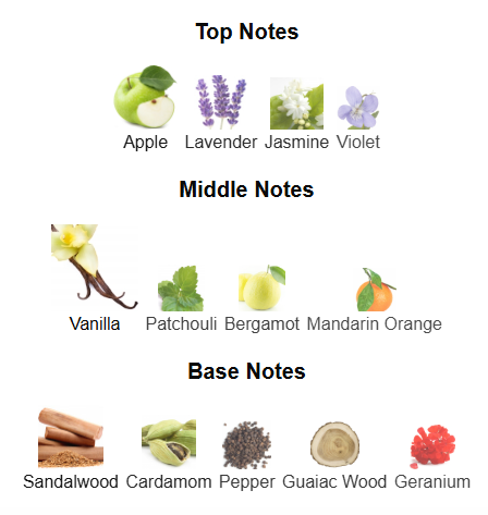 Heart: Sweet vanilla and powdery tones with earthy patchouli and citrus from bergamot and mandarin.