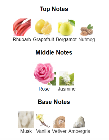Top Notes: Rhubarb, Grapefruit, Bergamot, Nutmeg
