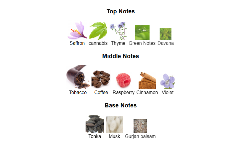 Top Notes: Saffron, Cannabis, Thyme, Green Notes, Davana