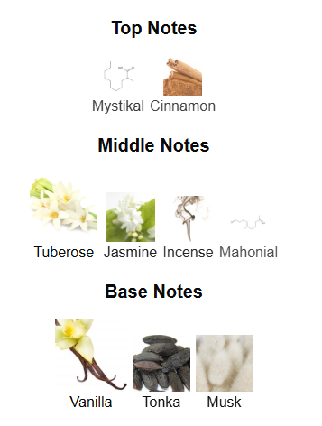Middle: Jasmine, Tuberose, Incense, Mahonial