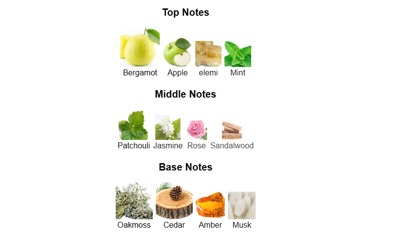 Middle: Jasmine, Rose, Patchouli, Sandalwood