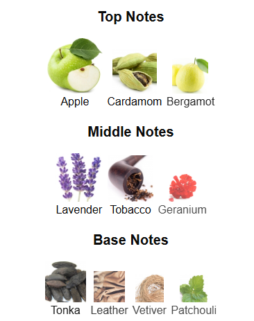 The fragrance opens with fresh touches of bergamot, cardamom and crisp apple, creating an inviting, vibrant entrance. The heart reveals lavender, geranium and a hint of tobacco — adding aromatic depth and a slightly smoky sophistication.The base then settles into leather, tonka bean, patchouli and vetiver, leaving a smooth and lasting finish that balances sweetness, spice and warm wood-leather tones.