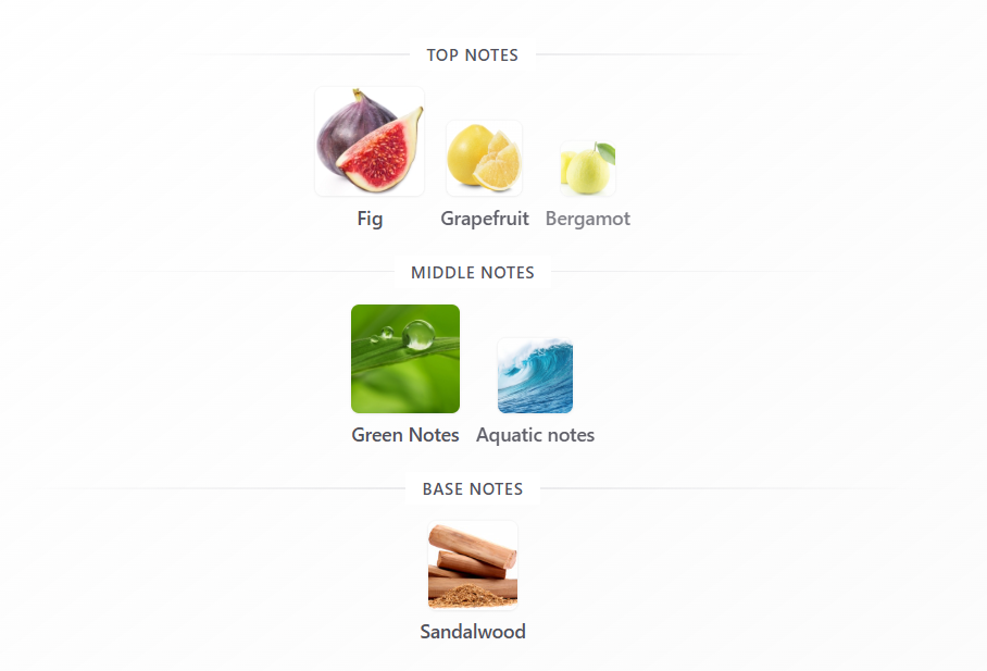 On first spritz, expect a lively mix of fig, grapefruit and bergamot bright and invigorating. Within 10–20 minutes, green and aquatic notes emerge, adding a fresh, rainforest-like character. After about an hour, sandalwood gently anchors the scent, creating a clean, woodsy dry-down that feels refreshing, balanced, and endlessly wearable.