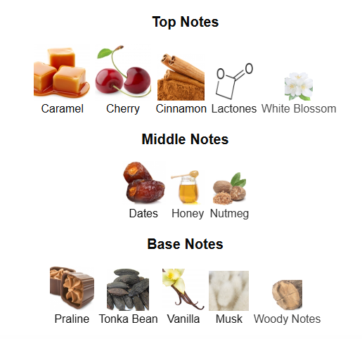 Base: Vanilla, Praline, Tonka Bean, Musk, Woody Notes