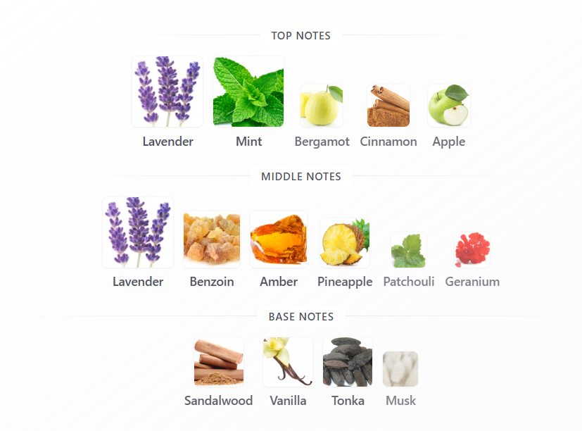 Top: Lavender, Mint, Bergamot, Cinnamon, Apple