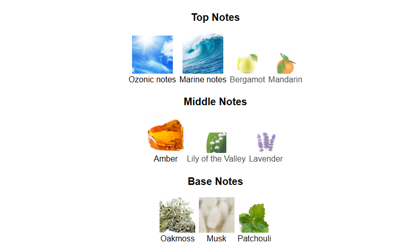 Top: Ozonic notes, Marine notes, Bergamot, Mandarin