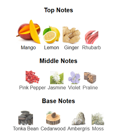 It gives a juicy, tropical-fruit opening (mango + citrus) that’s tempered by spicy and floral heart facets