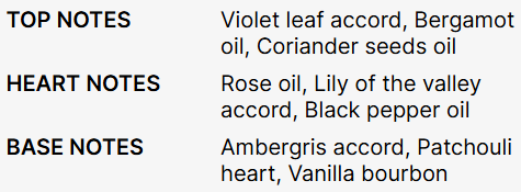 The opening greets the senses with violet-leaf accord, bergamot, and coriander seeds — crisp and slightly aromatic. In the heart, rose oil, lily-of-the-valley and a hint of black pepper bring floral elegance with a touch of spice. The base settles into ambergris accord, patchouli heart and bourbon vanilla — warm, smooth and enduring.