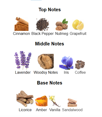 The fragrance opens with a spicy blend of cinnamon, black pepper, and nutmeg, balanced by the citrusy brightness of grapefruit. The heart reveals a sophisticated mix of lavender, iris, and coffee, adding depth and complexity. The base notes of licorice, amber, vanilla, and sandalwood provide a warm, sweet, and woody finish, grounding the composition with elegance.